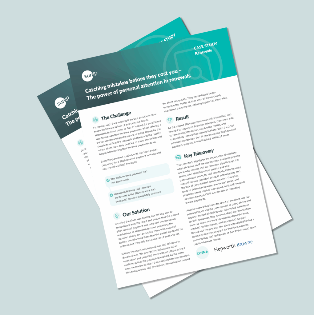 Sun IP swiftly onboarded a new client and processed a time-sensitive patent renewal over a single weekend