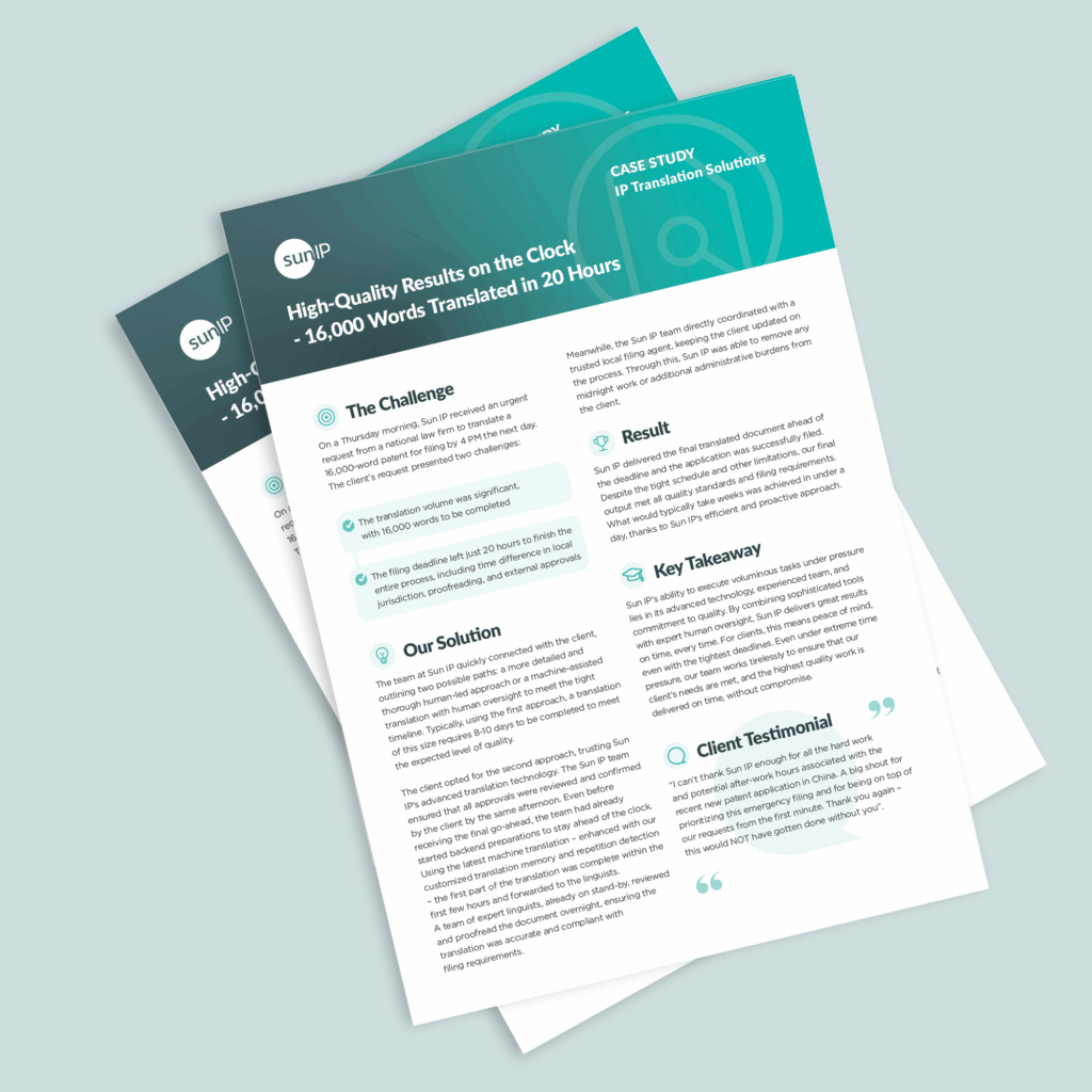 Sun IP successfully delivered a high-quality, 16,000-word patent translation within just 20 hours for a national law firm facing a tight filing deadline